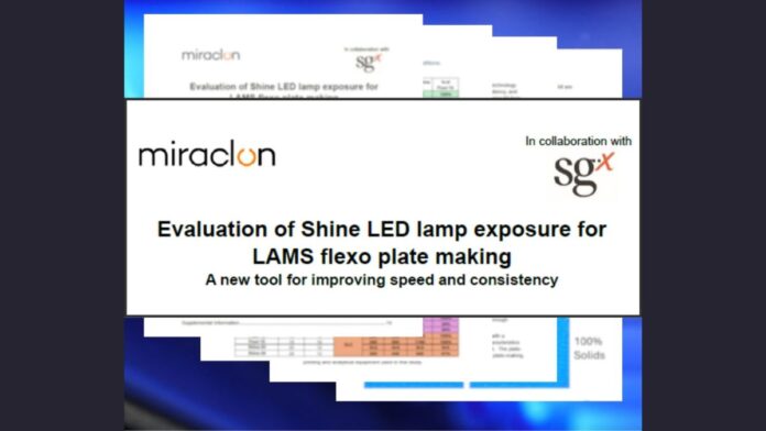 Miraclon, in partnership with US-based trade shop, SGX, has concluded a recent study that confirms the Shine LED Lamp Kit, innovated by Miraclon, produces high-quality plates that provide measurable benefits for a full range of LAMS flexo plates over fluorescent exposure. The results from the collaboration, which included comprehensive testing of five different LAMS plate types, have been published in a technical paper – available from Miraclon.