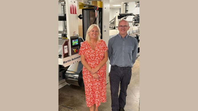 Zenna Parfaniuk and Jamie Hyde with The Label Makers’ new Martin Automatic MBS fitted to an MPS flexo press.